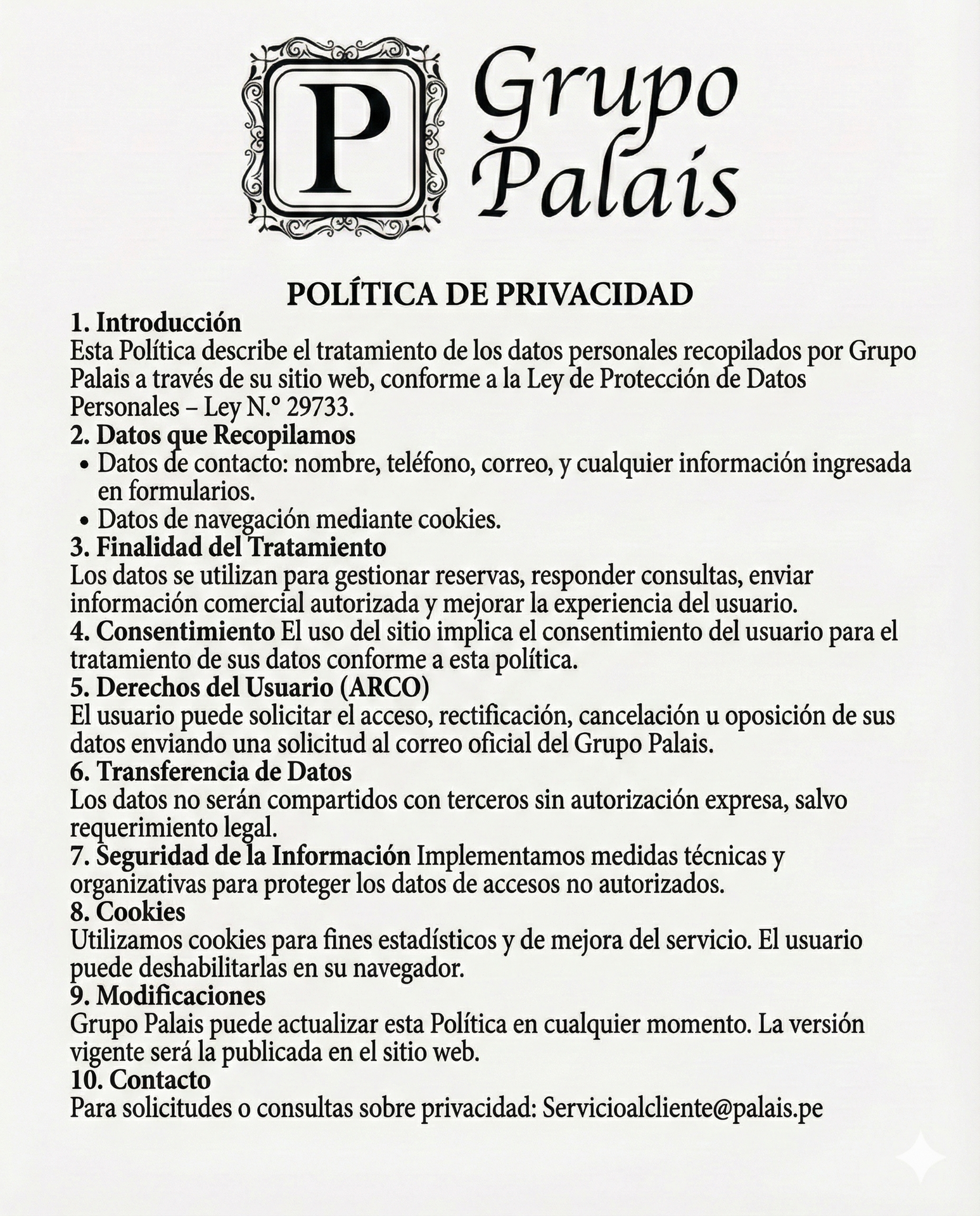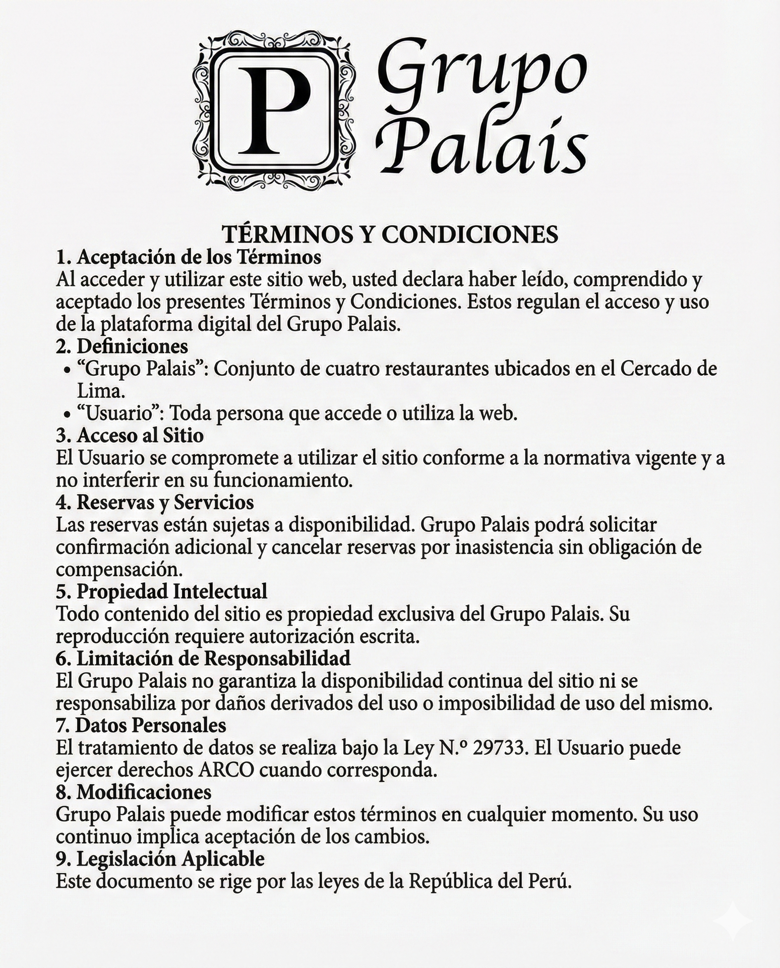 Conectar a nuestros clientes con experiencias gastronómicas memorables a través de nuestras cuatro marcas. En Grupo Palais trabajamos para ofrecer sabores auténticos, un servicio cálido y ambientes que inviten a disfrutar cada momento.